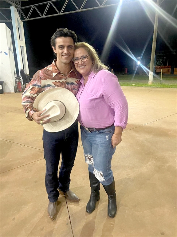 O ator Felipe Simas, na foto com a viúva do narrador, Sandra, é o Asa Branca, no filme que será lançado em dezembro (Foto: Divulgação)