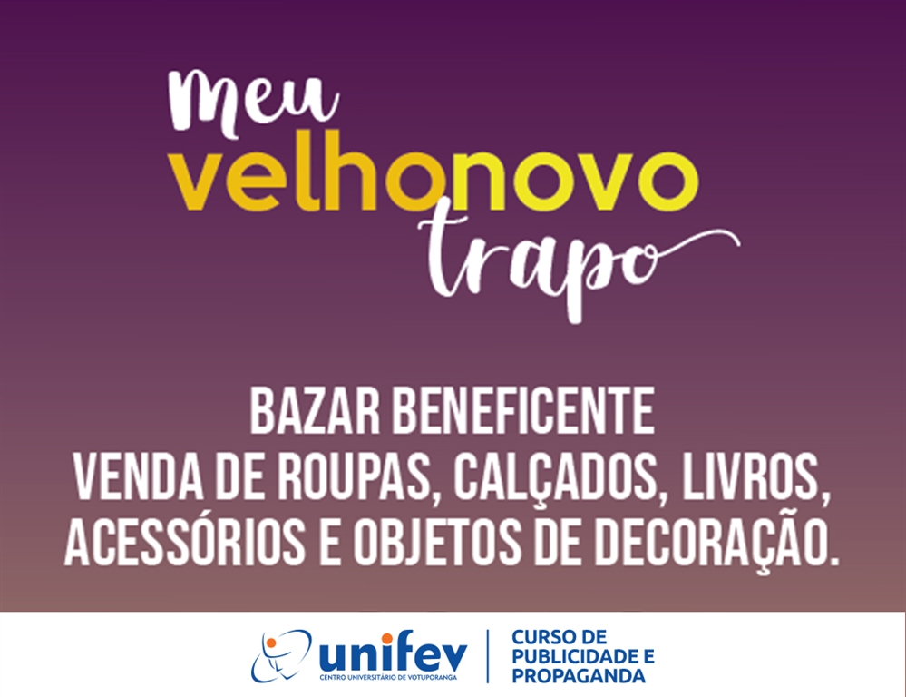 O curso de Publicidade e Propaganda da Unifev realiza, de 20 a 24 de agosto, o bazar Meu Velho Novo Trapo. Posteriormente, os alunos escolherão a associação beneficente que receberá a doação do dinheiro arrecado.