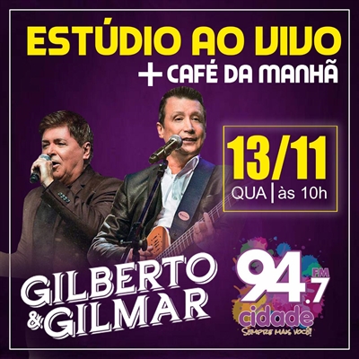 Na manhã de amanhã (13), a Cidade FM recebe a dupla Gilberto e Gilmar. A rádio 94.7FM sorteará 15 ouvintes para acompanhar a visita dos cantores, às 10h, e tomar um delicioso café da manhã na companhia dos artistas.