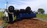 Basculante levava terra para obras em estrada quando o motorista perdeu o controle da direção; apesar do susto, não houve feridos