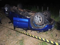 Carro saiu da estrada rural que liga ao Carrilho, arrebentou cerca de arame farpado e capotou