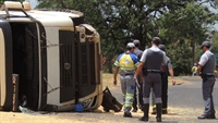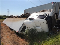 Carreta carregada com 36 toneladas de soja tombou após colisão em trevo da rodovia