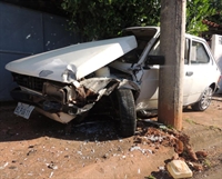 Fiat 147 ficou totalmente danificado entre muro de residência e poste; motorista foi socorrido à Santa Casa