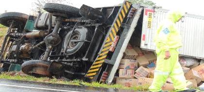 Pneu de caminhão estourou e motorista perdeu o controle do veículo, que capotou