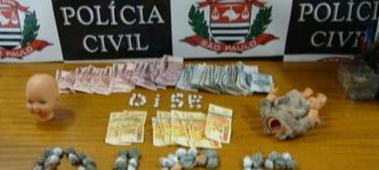 Droga, dinheiro e boneca foram apreendidos pelos policiais da Dise