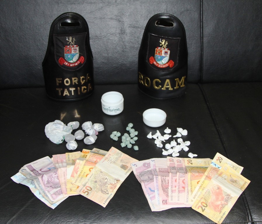 oito porções de maconha, 23 porções de cocaína e 19 pedras de crack prontas