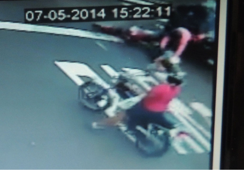 O suspeito subiu em uma moto parada nas proximidades, onde o comparsa o aguardava. Na fuga, seguiram pela rua Tietê, mas no cruzamento com a rua Pernambuco, colidiram contra a traseira de um automóvel Ford Eco Sport e foram ao solo. A seqüência foi toda flagrada pelas câmaras do circuito interno de segurança de uma loja.