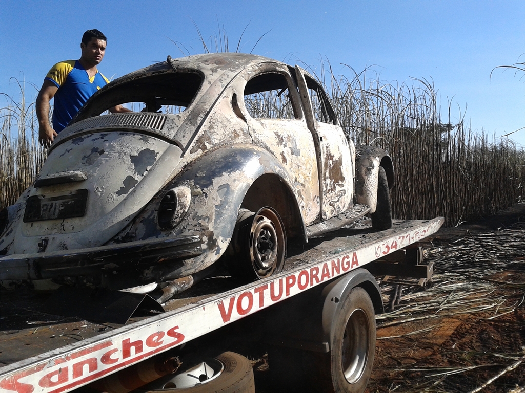 Na parte de trás do canavial, próximo a uma mata, chamou a atenção que havia um rastro de plantas caídas. No interior do canavial, foi localizado um automóvel VW Fusca, totalmente carbonizado. Os policiais levantaram então, pela placa do veículo, o nome do proprietário.