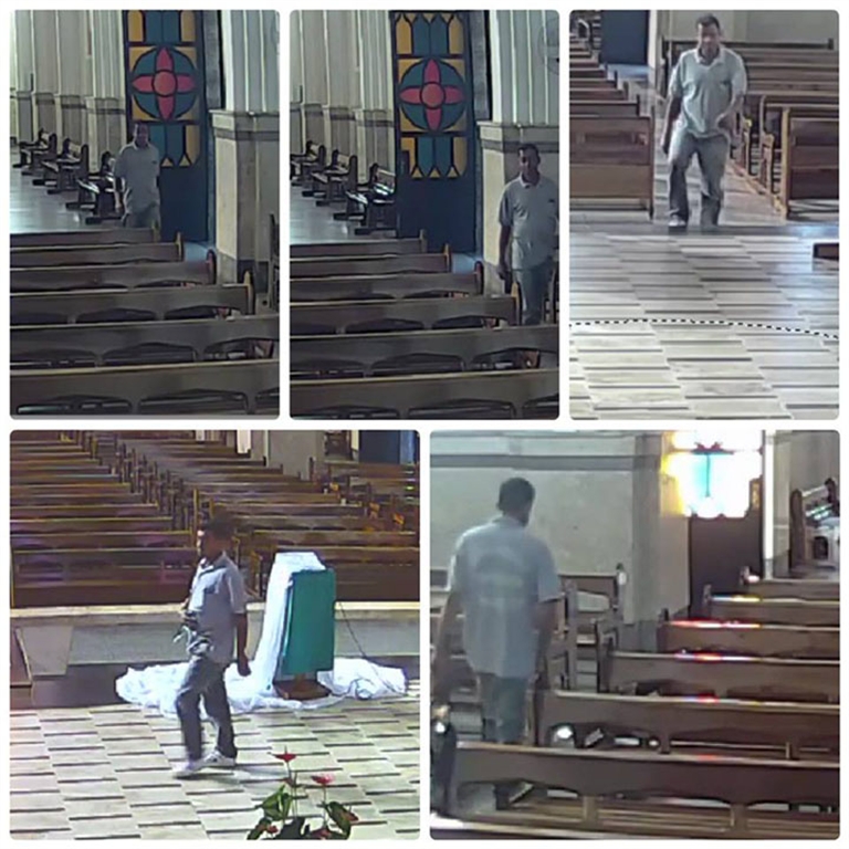 Nas imagens feitas por câmeras, o homem moreno, alto, trajando tênis branco, calça jeans e camiseta cinza surge na igreja pela lateral direita. O suspeito caminha pelo altar, vai até o altar, por trás de onde a imagem de Nossa Senhora está exposta e subtrai a coroa. Em seguida, ele deixa o local, pelo lado oposto de onde entrou.