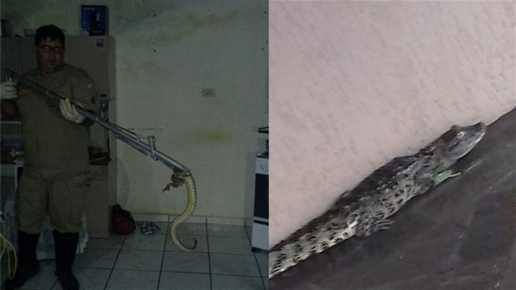 O jacaré estava andando pelas ruas de Nhandeara, enquanto a cobra se escondeu atrás de um botijão de gás em Valentim