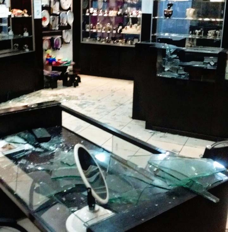 Com um pé de cabra, os assaltantes se aproximaram de uma das vitrines, quebraram o vidro e invadiram a loja. Eles pegaram centenas de joias e relógios.