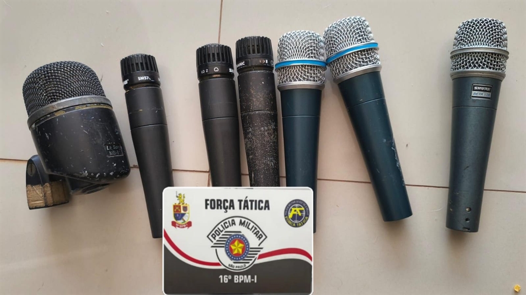 Microfones furtados foram recuperados pela Polícia Militar na nesta quinta-feira (29), por volta das 18h, em Votuporanga, após trabalho de patrulhamento direcionado da equipe de Força Tática.