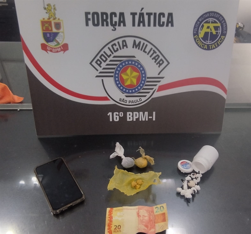 Ao perceber que seria abordado, o menor arremessou um objeto de cor branca ao solo. Após buscas, os policiais localizaram o objeto, que continha diversas porções de entorpecentes. Em seguida, foi realizada a busca pessoal, sendo encontrados com o adolescente uma nota de R$ 20,00 em dinheiro e um aparelho celular da marca Samsung.