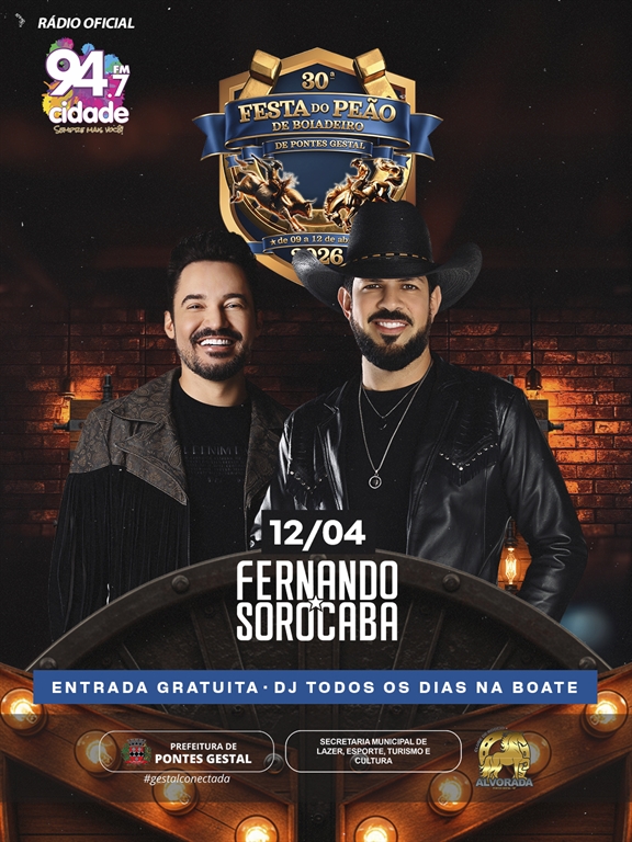 Pontes Gestal encerra neste domingo (12) as comemorações dos 61 anos com a final do rodeio e show de Fernando e Sorocaba, após programação que inclui neste sábado apresentação de Kleber e Cauan e provas tradicionais no Recinto de Exposições Crédito: Divulgação