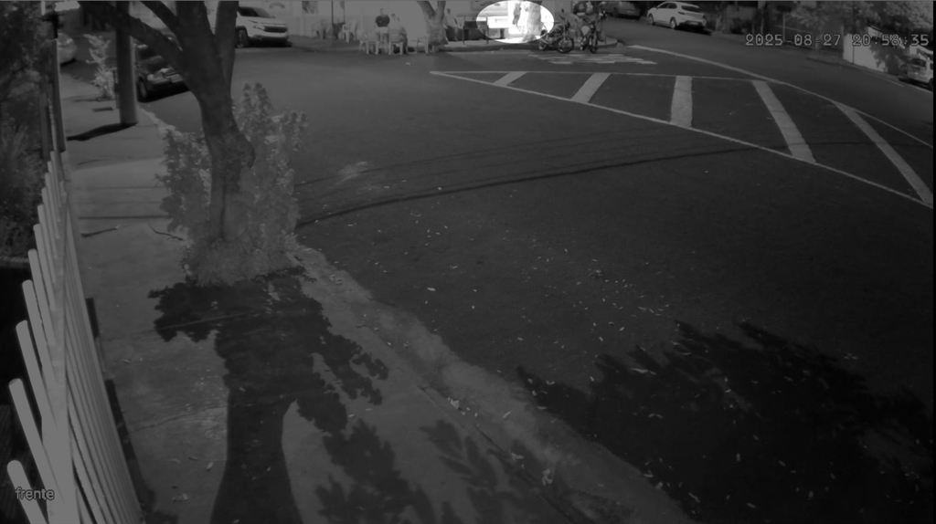 Às 20h58, as câmeras registraram o ataque. Guerche percorreu a rua correndo, tomou impulso e acertou Milton com uma “voadora”, fazendo com que a vítima caísse para trás, ainda sentada no banco. Na sequência, conforme a denúncia, arremessou com as duas mãos o bloco de concreto de 5,1 kg diretamente contra o peito de Milton, atingindo a região torácica com extrema violência.