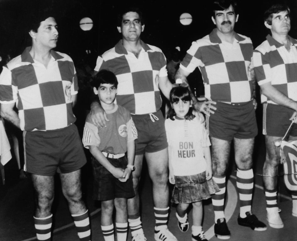 • Com esta camisa quadriculada, o Maringá EC, mais conhecido como time do Frei Arnaldo, foi o “bicho-papão” do futebol de salão na década de 60. O nome de Maringá  deu-se por ser formado com apoio de Maringá Materiais de Construção, empresa de propriedade do saudoso comerciante e esportista Antônio Frederico. A equipe tinha jogadores que, de fato, faziam diferença. Na foto, Fifo (falecido no domingo passado), Rui Marão, João Abbas (Chapa) e Escudeiro. Impossível falar desse time sem lembrar também os atletas Baiano e Palestra. Os meninos da foto (mascotes) não conseguimos identificar. A foto é do arquivo pessoal de João Abbas.