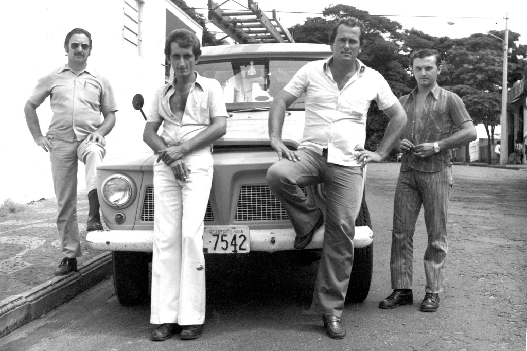 • Pessoal da Prefeitura responsável pela decoração natalina da cidade na década de 70. Na esquerda, Pedro Quinália (o chefe), seguido de Aristides Caldeira, Rubens e Pedro do Carmo (Pedrinho). Ao fundo, o velho Willis utilizado no transporte do pessoal. Esta foto foi registrada na primeira administração de João Antonio Nucci (1977 -1982).